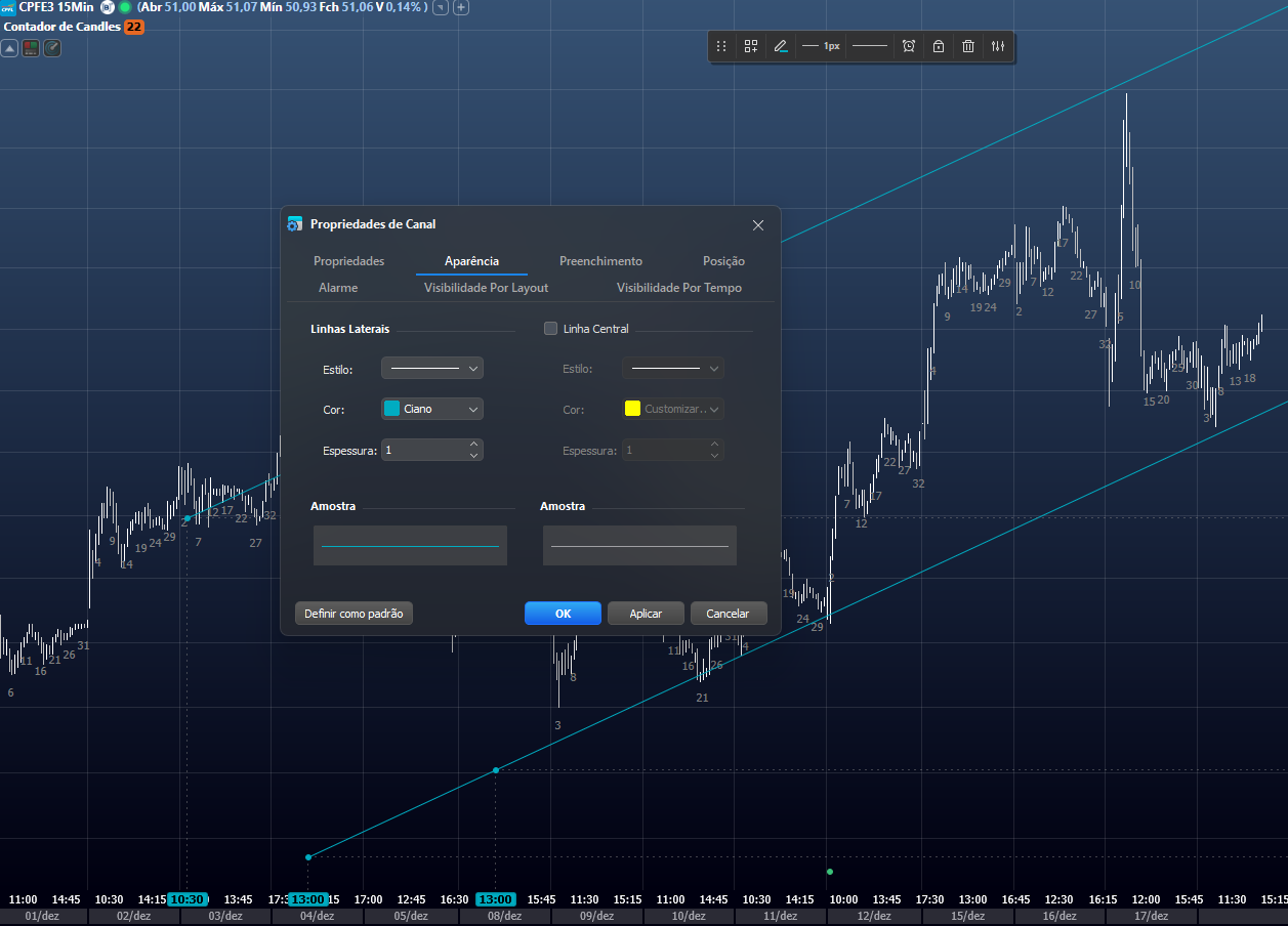 Em alguns estudos é possível configurar um padrão de aparência, como cor das linhas do estudos, tamanho e estilo, assim toda vez que um novo estudo do mesmo tipo for traçado, virá com a aparência padrão. Abaixo temos o exemplo do Estudo Canal: