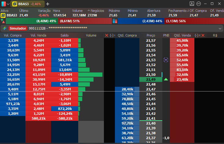 Uma forma de verificar estes volumes é utilizando o SuperDOM com a coluna de Volume At Price configurada para Volume Financeiro: